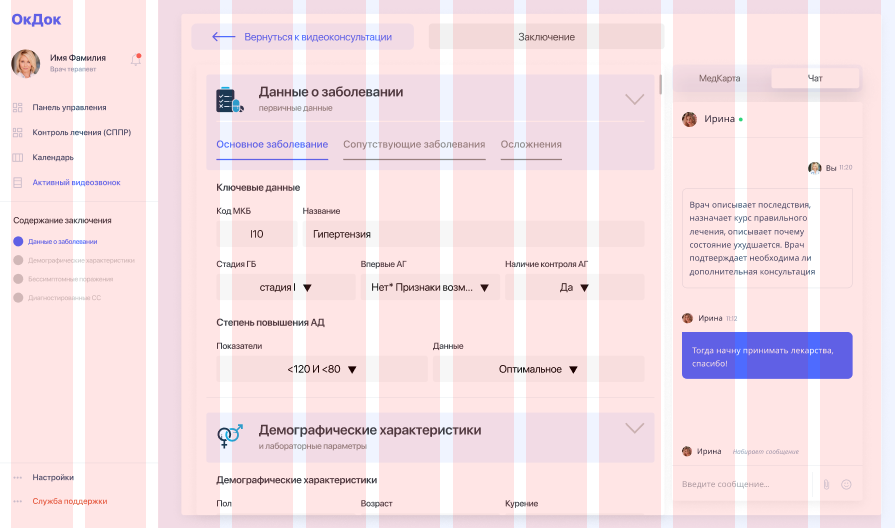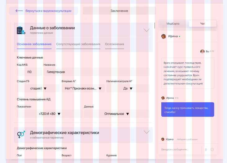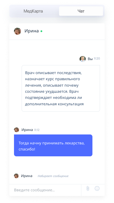 Switching in the chat during a call will help the doctor not only write in the chat during an online call, but also switch to the patient's medical record and quickly find out the necessary information from the anamnesis.