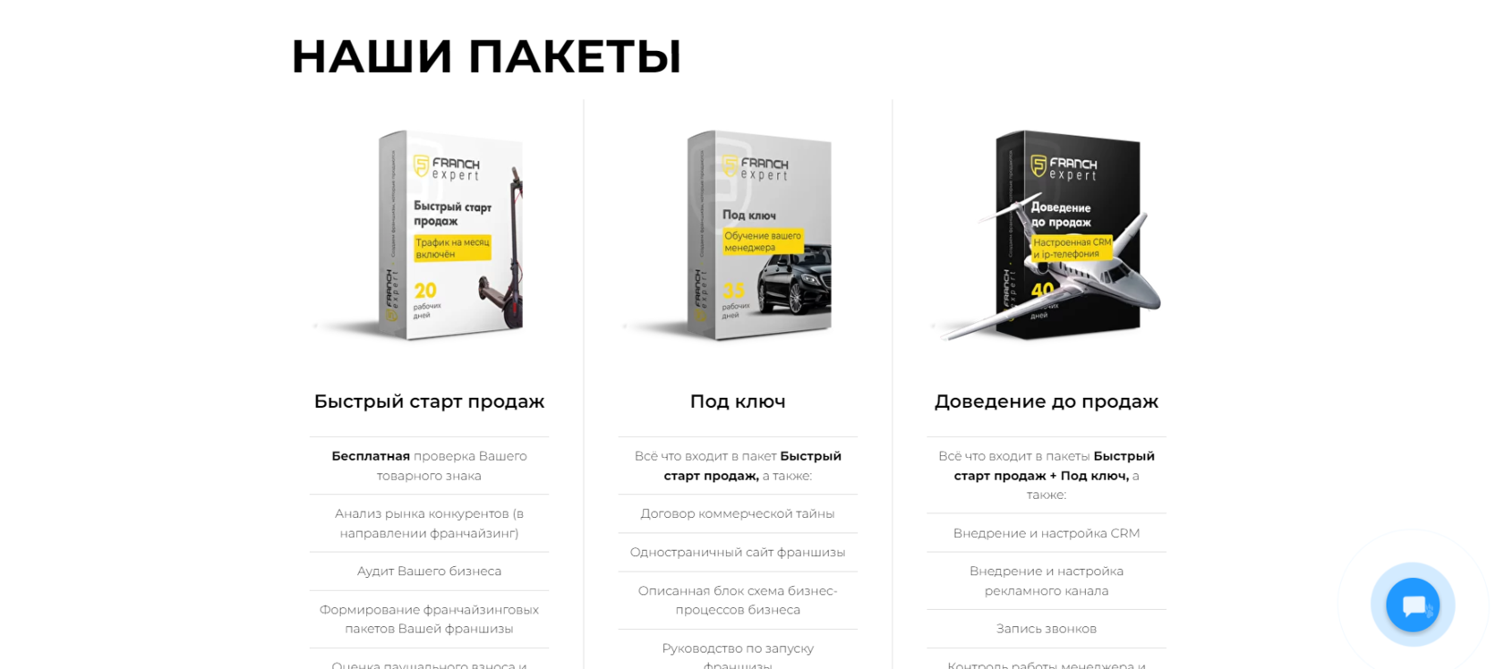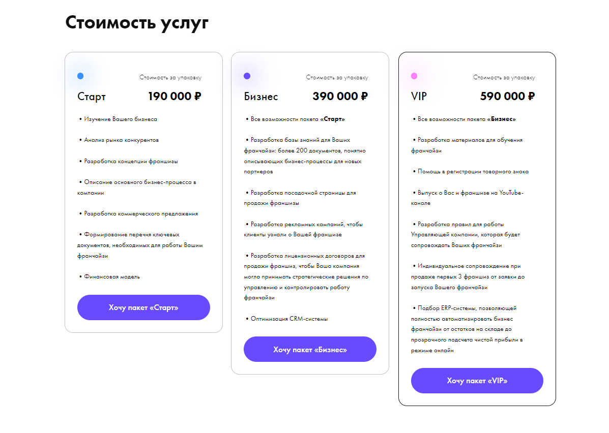 Пакетные предложения услуг с описание по пунктам и CTA кнопкой заявки.