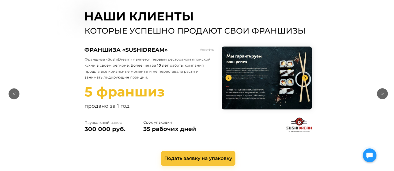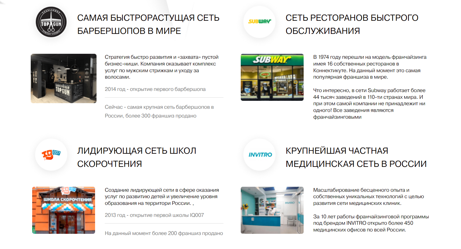 Акцент на кейсах, конкуренты отображают описание + количество проданных франшиз как собственное портфолио.